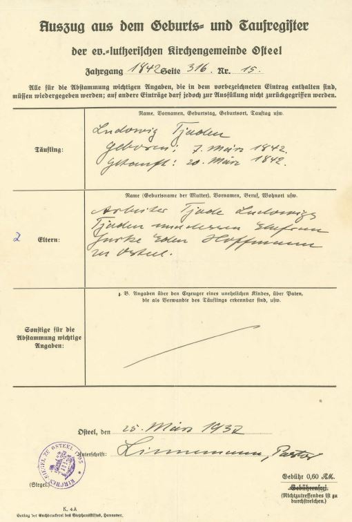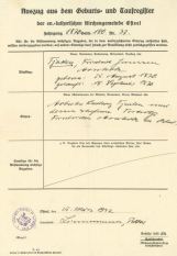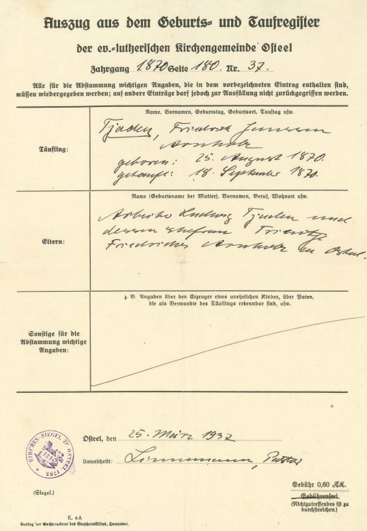 Birth certificate Friedrich Janssen Arnholz (tree 9) |