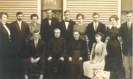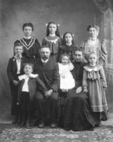 George Seigmund Tjaden and Hemke Saathoff and eight of their nine children. "In back, left to right: Gretje "Grace" (Tjaden) Ackerman, Marie (Tjaden) Johnson, Harmina "Mini" (Tjaden) Blank, Folka "Folly" (Tjaden) Ackerman. Front, left to right: Wilke "Bill" Tjaden, HarmTjaden, George Tjaden, George Tjaden Jr. (on Hemke's lap) Hemke (Saathoff) Tjaden, Tena (Tjaden) Gerdes. Hemke made all the dresses. Folly is in her wedding dress and is probably pregnent (per Velma Fritz). This would date the picture at about 1907-8." Picture: Alvin "Al" Johnson |